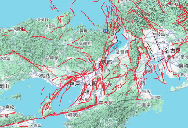 関西圏は「新潟-神戸ひずみ集中帯」の活断層が密集したエリアで、更に未知の活断層もあります。