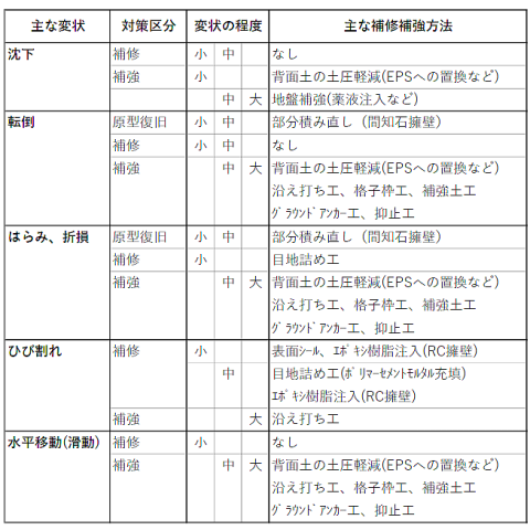 擁壁の変状と対策の概要は以下になります。