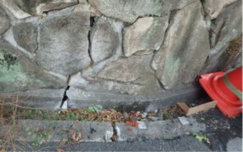 道路側溝部より沈下し、石の目地が開いています。