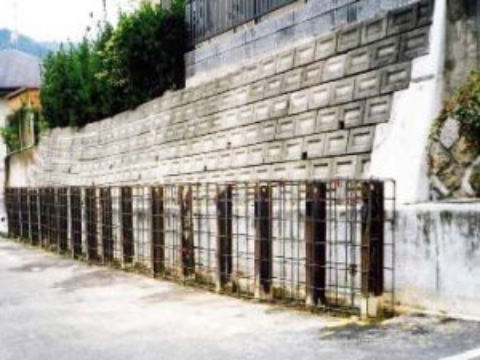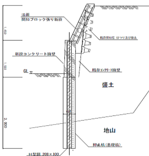 既存間知ブロック擁壁の外部側に、支持杭新設の上、練積み間知ブロック擁壁を新設しました。