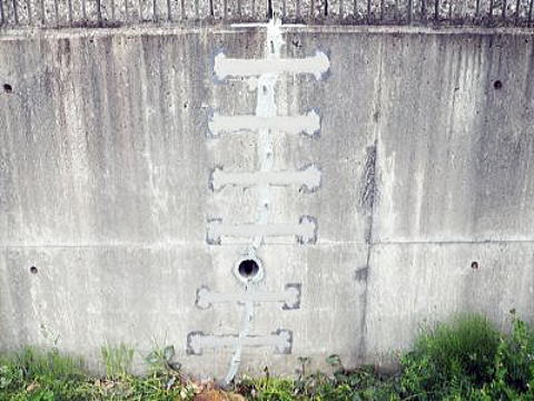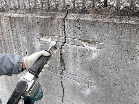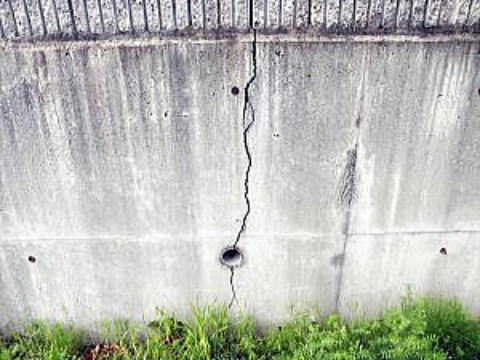 コンクリート擁壁に幅の広い構造クラックが発生しています。