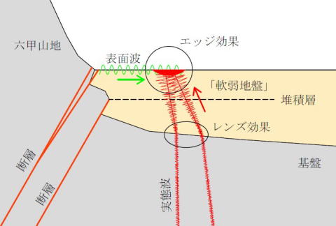 ・実態波が基盤と堆積層の境界で屈折し、ある点に集中する