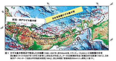 前者は、国土地理院のGPS観測網(GEONET) によって検出された現在のひずみ速度の速い領域であり、後者は、過去300 約300万年前から大きな短縮変形が生じたことが地質学的に示されている領域です。