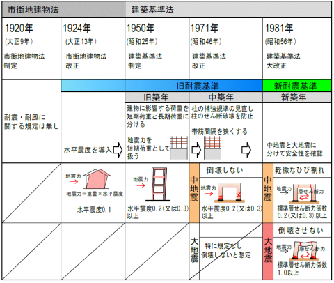 国民の生命、健康及び財産の保護」ですが、大地震ごとに震災被害を教訓に耐震基準の改正が行われ、昭和56年の改正を境に旧耐震基準から現在の