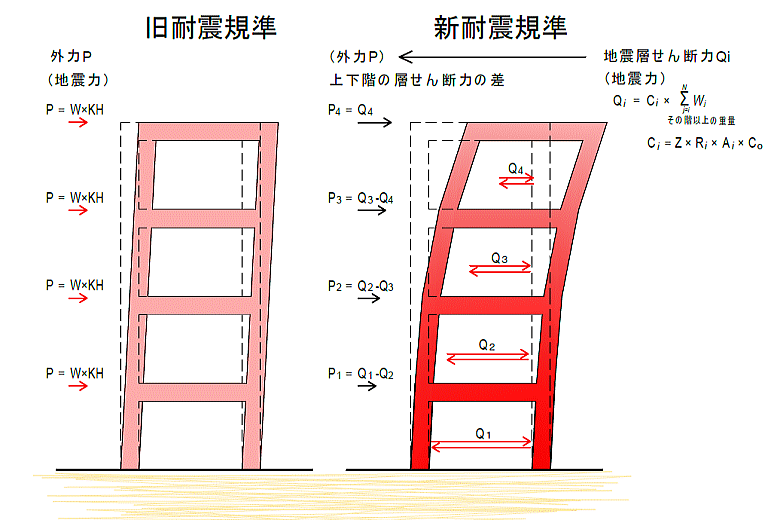 旧耐震基準の時代では、地震力は水平震度から想定されましたが、新耐震基準では、標準せん断力係数Coで地震力を想定する考え方に変わりました。