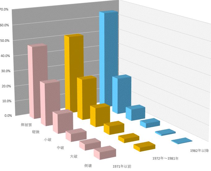 旧耐震設計法では、中規模の地震動(震度5強程度)に対して、家屋が倒壊・崩壊しないというもので、震度5強よりも大きい大地震(震度6強程度)は想定されていませんでした。