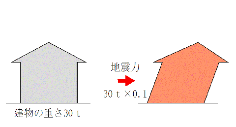 例えば、建物の重さが30tの場合の地震力を建物の重さの1割(=1/10)の3tとします。