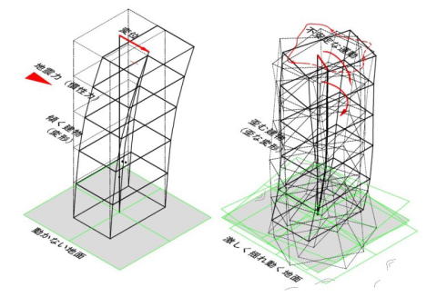 損傷を増大させるねじれ振動も伴い建物に損傷や破壊を生じさせます。
