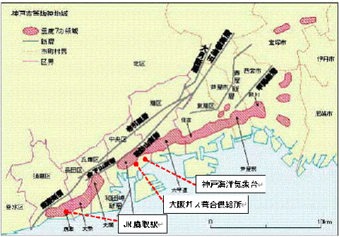 震度7の震災の帯の中はJR鷹取のみで、大阪ガス葺合供給所で震災の帯の際付近、神戸海洋気象台は震災の帯の外です。