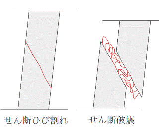 ※せん断破壊は、ずれ合う力(せん断力)により生じる破壊で、小さなたわみで耐力を急激に失い、鉛直力(建物の重量)を負担できなくなり破壊に至る、ぜい性的な破壊となるのが特徴です。