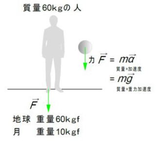 例えば月面上で体重を計ると引力(重力加速度)が地球上の1/6になりますので、体重も1/6になります。