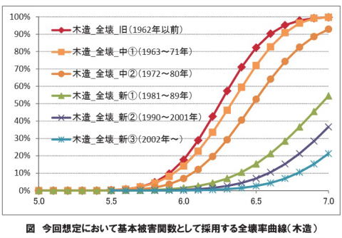 東京都で作成された全壊率曲線は、築年別の違いを更に細かくまとめられています。