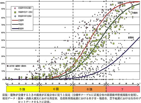 震度7は上限のない震度であり、全壊率曲線で旧築年・中築年は計測震度7.0(となる地震が発生するのか想像できませんが)でほぼ100%全壊になっています。