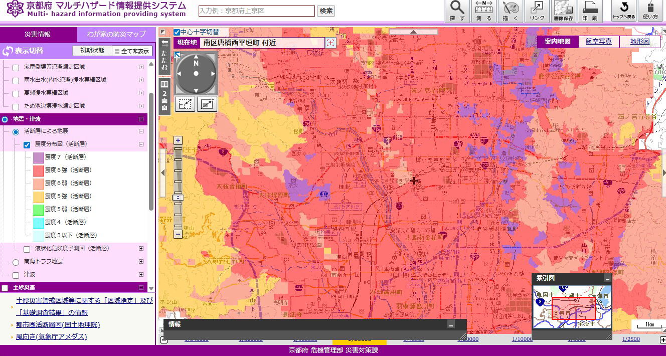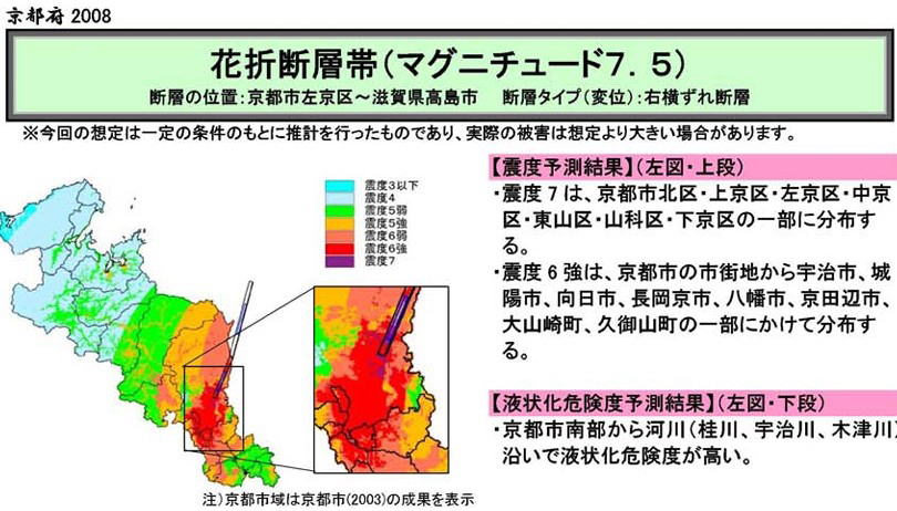 地元の京都周辺に多くの活断層が有りますが、「花折断層帯」による地震が発生すると、広範囲に震度6強の揺れが発生します。