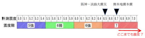 阪神・淡路大震災での震度7 は体感によるもので、計測震度の推定は6.5 ほどと見られています。
