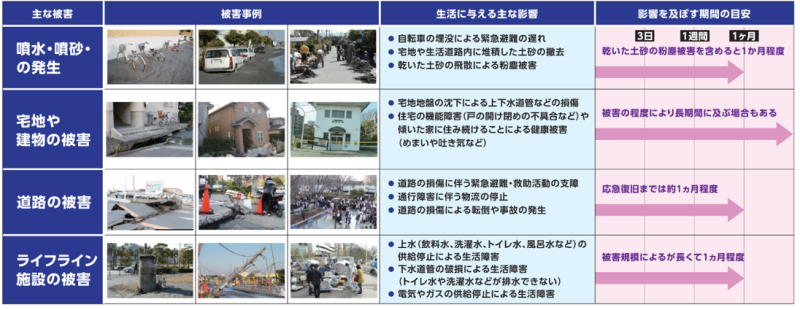 液状化による代表的な被害と地震後の生活に及ぼす影響例