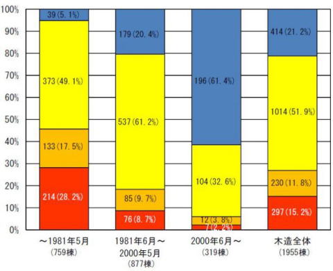 2000年基準で建てられたものでは、無被害が61.4%と明らかに耐震性が向上していますが、2000年基準でに建てられたものであっても、建築基準法は 「
