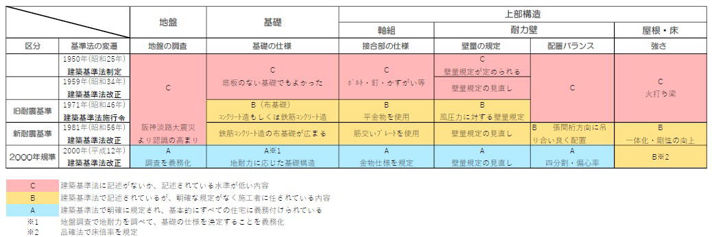 現在に至るまでの各基準法により建設された住宅の耐震性に違いが生じ、建築時期の古い建物程に耐震性が低くなります。