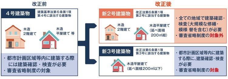 法改正後、現行の4号建築物は無くなり、新たに「新3号建築物」と「新2号建築物」に分かれます。