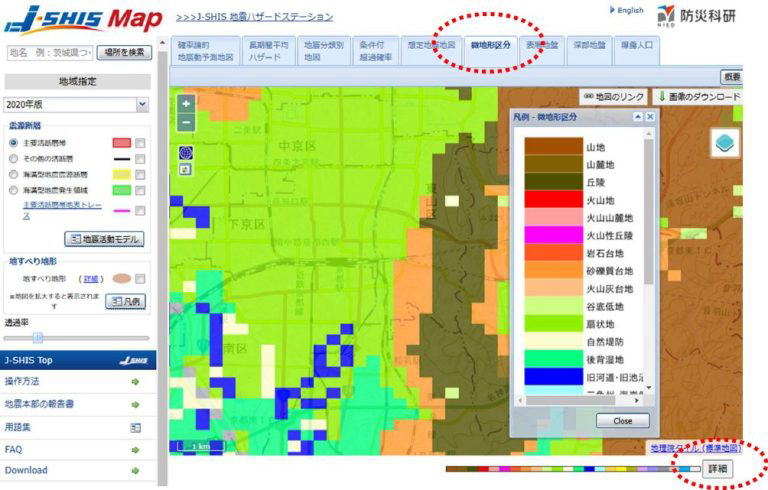 右下の詳細ボタンで、微地形区分の凡例が表示されます。