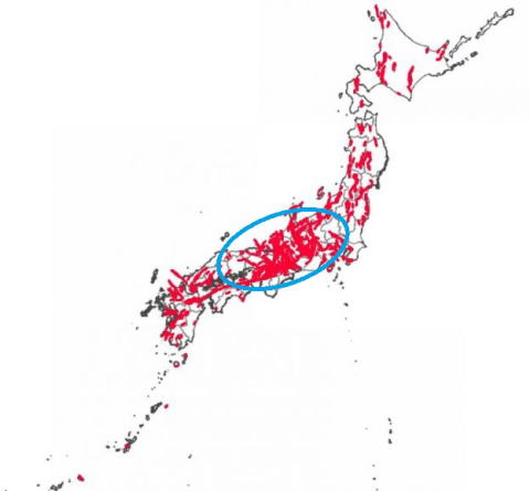 2000ヶ所/2000年=1ヶ所/年となり、毎年どこかで活断層による直下型大地震が発生してもおかしくないのが、日本の国土の実情です。