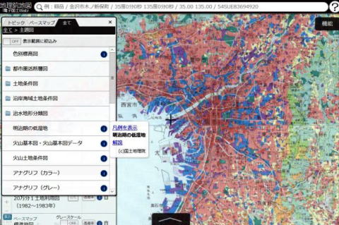 過去の土地利用状況を確認できるページでは、 国土地理院の20万分1土地利用図のページの下の方で、 20万分1土地利用調査は、「地理院地図」の情報リストメニューから「主題図」→「20万分1土地利用図(1982~1983年)」を選択することで閲覧できます。