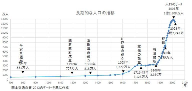 日本の、西暦700年以降の長期的な人口の推移は以下のグラフになります。