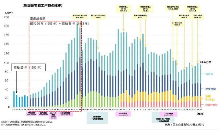 日本は高度経済成長期(1955年~1973年までの19年間)で名実ともに経済大国となり、人口は1億人を超え、住宅着工数もその間に一気に増大しました。