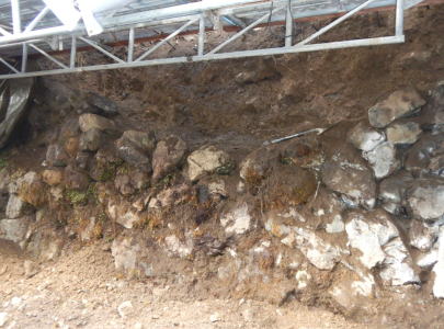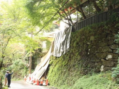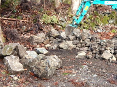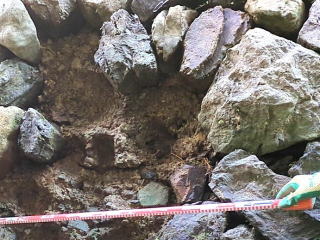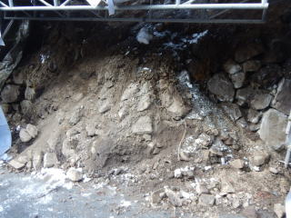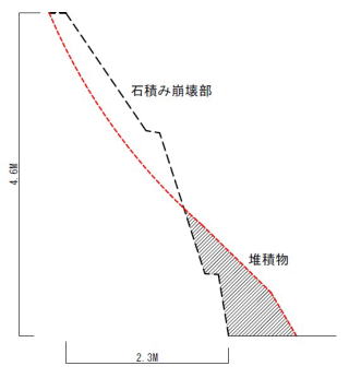 崩壊面は地山が露出し、地面には積み石と共に土砂が多量に流出しています。
