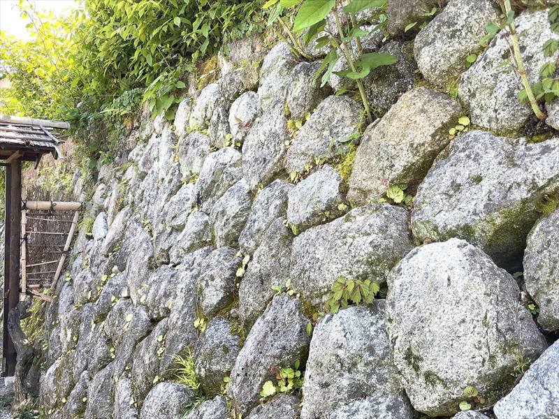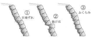 石材間の接合部が弱いため、大きくはらみ出すと地盤ごと石積みが崩壊します。