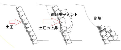 主働土圧の上昇により、自重で土を押さえきれず石積みが押しだされ、はらみや折損が生じている場合は崩壊リスクが高い危険な状態で早期の対策が必要です。