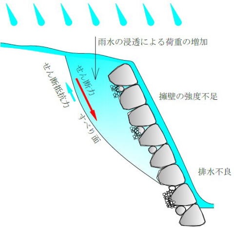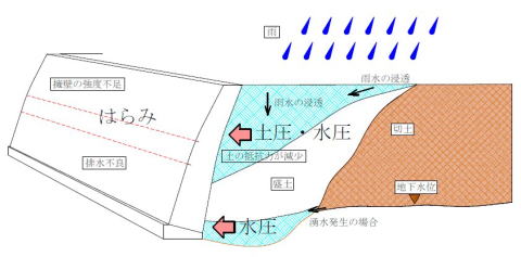 山岳地や丘陵地の自然斜面でも、排水不良で擁壁裏面に雨水等が溜まり、降雨によって地山が雨水で飽和し、有効圧力やすべり面における摩擦力、粘着力が減少して地滑りや崖崩れに至る場合が有ります。