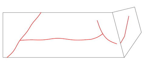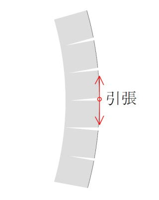 面の両側で引張られると、引っ張られる面の中央部分が引き裂かれる(赤線)イメージです。
