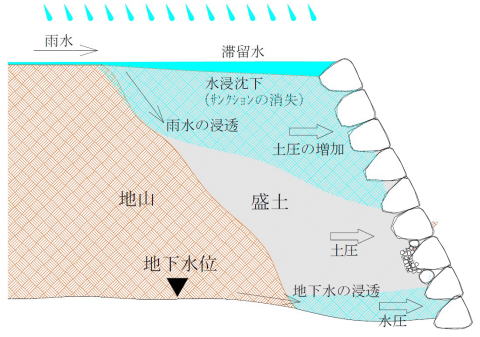 【原因】背面土への雨水や地下水の侵入による土圧の増加