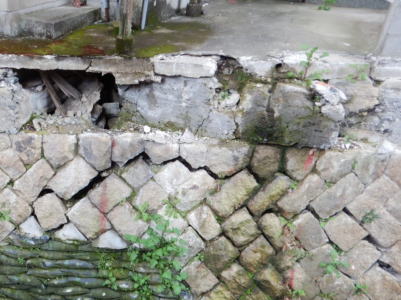 空石積み擁壁は、震度5強の中地震でも崩壊する危険性が有りますので、それ以上の大地震では更に被害が拡大します。