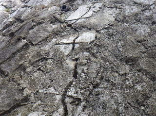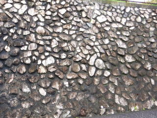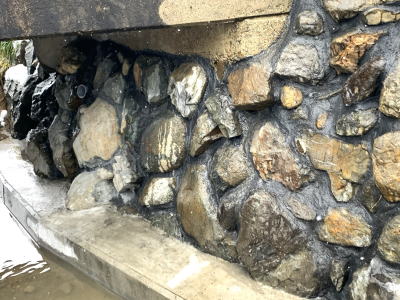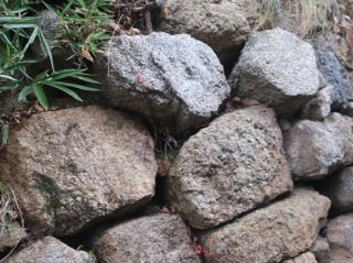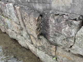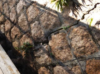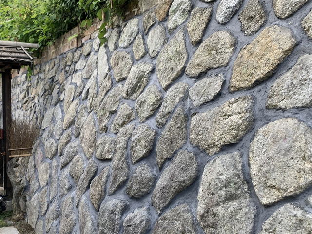 空石積み擁壁の目地にモルタルが詰められている場合、目地モルタルが割れたり、石から剥がれてひび割れが生じます。