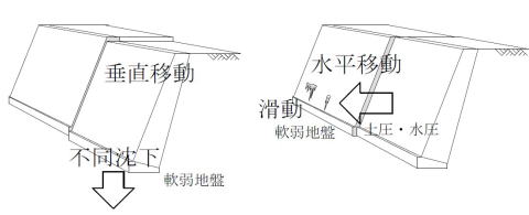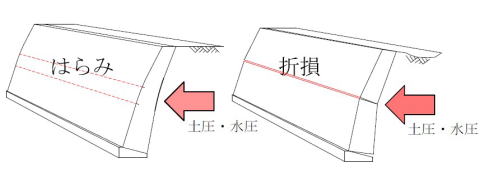 【原因】地震力、地盤沈下、背面土圧、水圧、荷重等