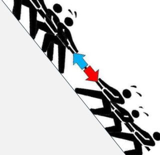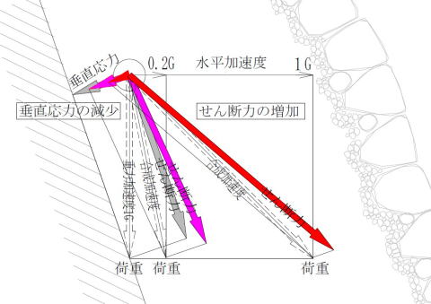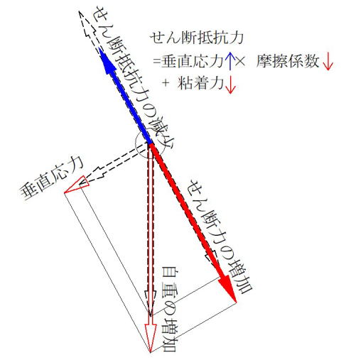 ごく短時間の激しい繰り返しの揺れの間に、土塊重量を増加したり斜面傾斜を大きくすることで、せん断力の増加と垂直応力の低下が発生し、崩壊しやすくなっていきます。