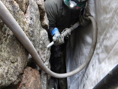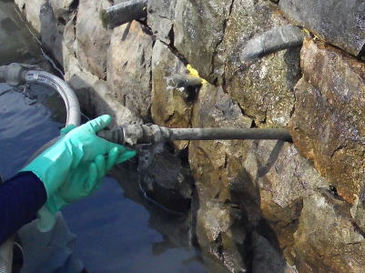 工法用の接着剤(モルダムエース)を、自然石の石積みや間知ブロックの内部に注入し強固に接着します。