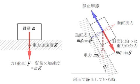 地上の物体には全て、地球の引力(重力加速度)により、地球の中心に向かう力「重力(重さ)=質量×重力加速度」が生じます。