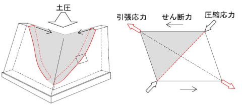 はらみ(ふくれ)により、曲げの作用で「水平ひび割れ」が生じますが、擁壁の隅付近は土圧・不同沈下・地震力が集中し、「せん断ひび割れ」や「せん断破壊」が発生しやすい箇所です。