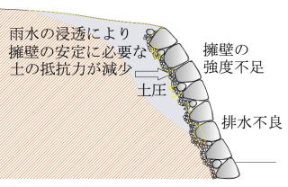 安息角を越える崩壊の危性が有る崖の安全性を確保するために、擁壁が設置されますが、特に擁壁としての強度が低い「空石積み擁壁」で崩壊が発生しています。