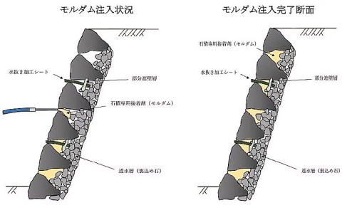 「モルダム工法」で石積み内部から強固に接着して固めることによって、石積み全体が一 枚岩のように一体化されます。