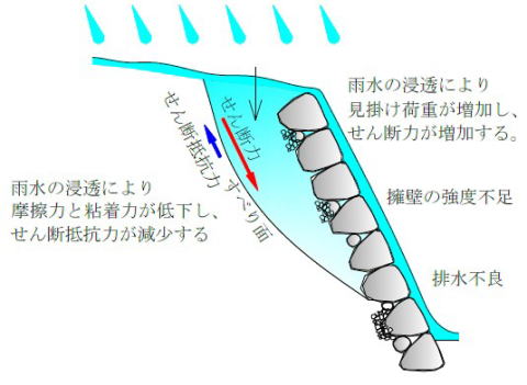 地震で生じる加速度により、土塊の見掛け重量が増大し、崩壊する原因になります。