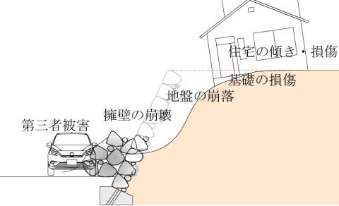擁壁の倒壊や崩壊が発生すると、建物に被害が生じるだけでなく、隣地や第三者にも被害を及ぼす危険性が有ります。