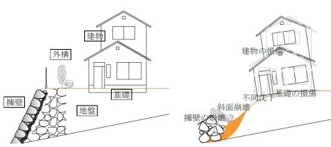 軟弱な地盤で不同沈下が生じたり、地震や豪雨災害で擁壁の傾きや崩壊により、住宅に被害が及ぶことも有ります。